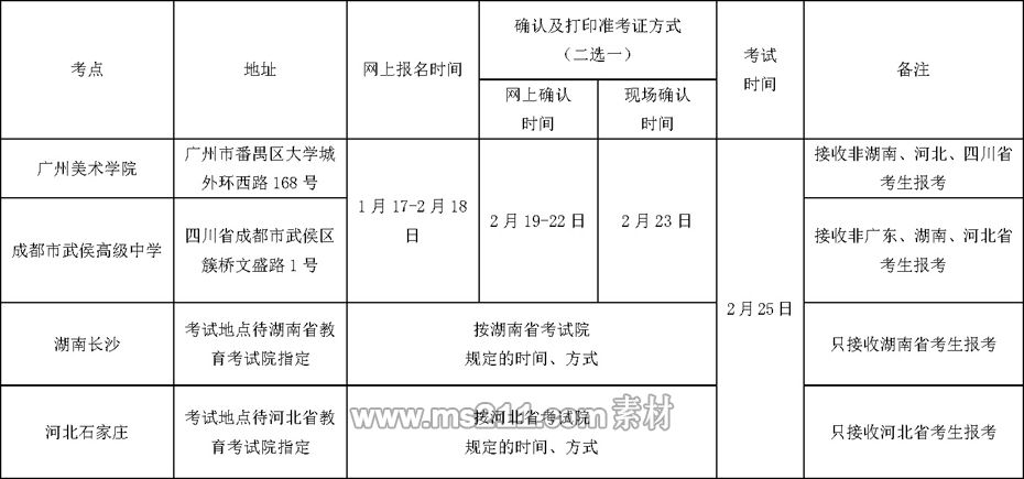 1、除美術(shù)學(xué)專業(yè)(美術(shù)史、藝術(shù)管理與策劃培養(yǎng)方向)、書法學(xué)專業(yè),其他各美術(shù)類校考專業(yè)在廣東省外的考點安排如下: