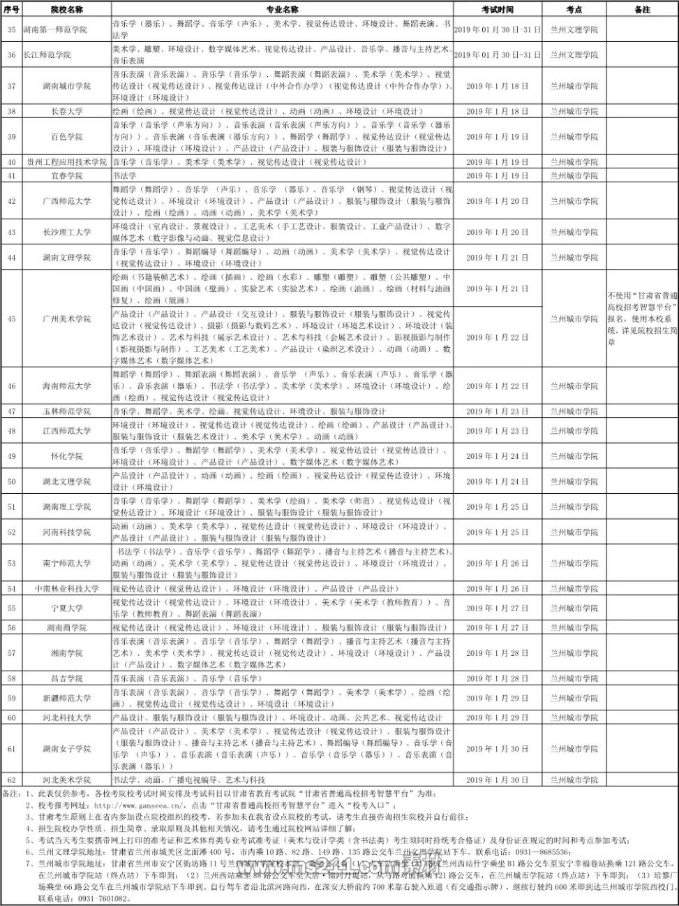 2019年1月5日開(kāi)始考生可登錄甘肅省體藝類(lèi)專(zhuān)業(yè)招考智慧平臺(tái)(http://art.ganseea.cn)進(jìn)行報(bào)名并向主考院校繳納考試費(fèi)(由甘肅省教育考試院代收),具體操作辦法詳見(jiàn)報(bào)名系統(tǒng)。