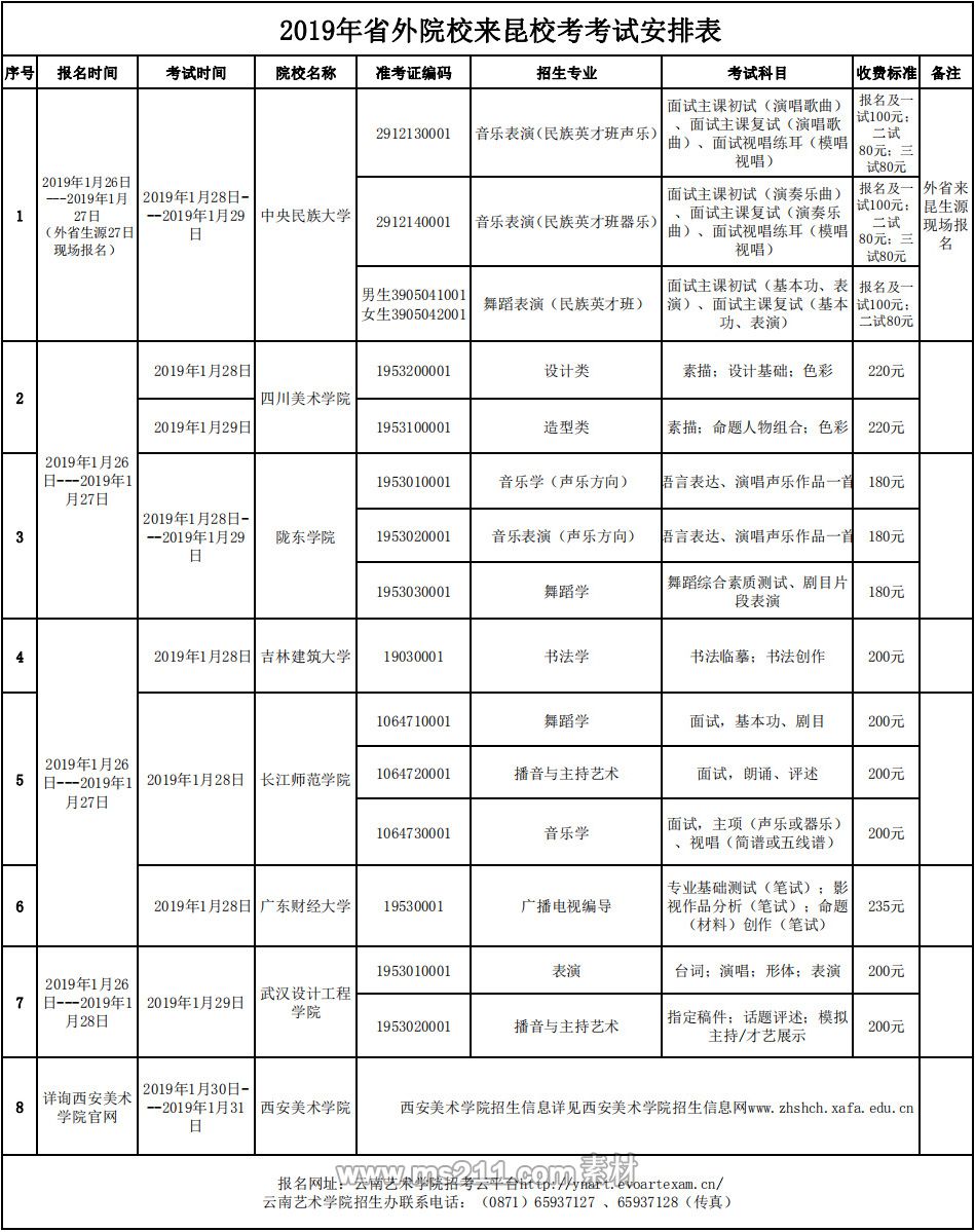 來云南省設點??嫉氖⊥庠盒C麊?、設點專業(yè)、報名和考試時間在云南藝術學院官網公布(http://www.ynart.edu.cn/),請考生注意查看,合理安排,按時應考。 云南藝術學院招生辦聯系電話:(0871)65937127 、65937128(傳真)。