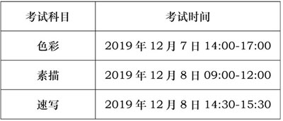 1、美術(shù)與設(shè)計(jì)類專業(yè)統(tǒng)考時(shí)間由原定2019年11月30日、2019年12月1日調(diào)整為2019年12月7日、8日。調(diào)整后的時(shí)間安排為:2019年12月7日11:00至12:00考生到考點(diǎn)熟悉考場,2019年12月7日下午、2019年12月8日全天考試。