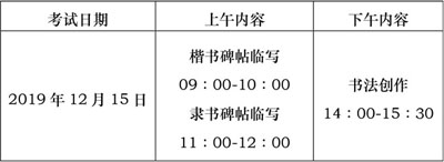 2、書法學(xué)(毛筆)專業(yè)統(tǒng)考時(shí)間由原定2019年12月8日調(diào)整為2019年12月15日。調(diào)整后的時(shí)間安排為:2019年12月14日16:00至20:00考生到考點(diǎn)熟悉考場,2019年12月15日全天考試。