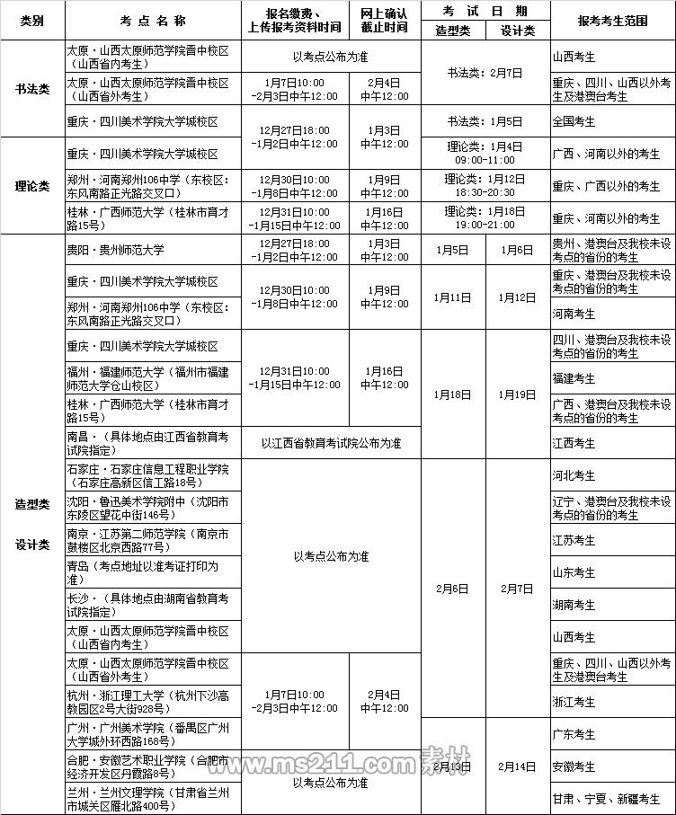 其中,報(bào)考書法類、造型類、設(shè)計(jì)類的四川考生,只能參加重慶考點(diǎn)(1月5日和1月18-19日)的考試。