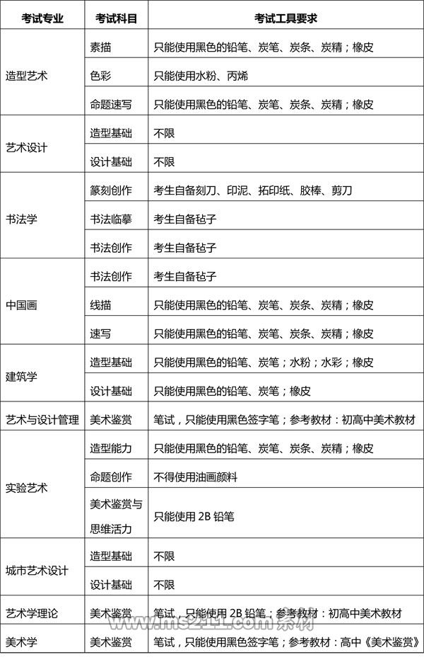 3.專業(yè)考試可以使用定畫液。“(三)專業(yè)考試工具要求”表格中各專業(yè)有限定工具材料的,一律按要求使用,若考生未按要求使用,閱卷時(shí)按違規(guī)處理;