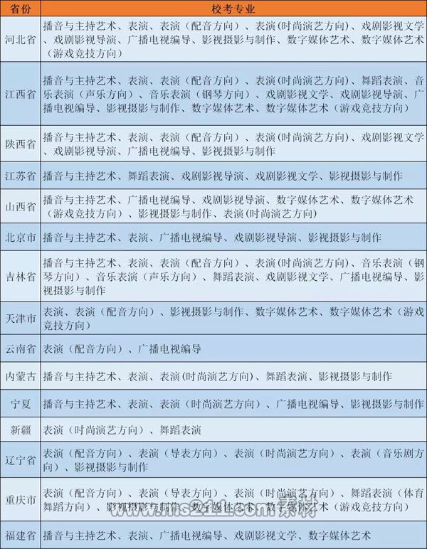 ?、俦硌荨⒈硌?配音方向)、 表演(時尚演藝方向)、表演(導表方向)、表演(音樂劇方向)、音樂表演、舞蹈表演(本科)、舞蹈表演(體育舞蹈方向)專業(yè):