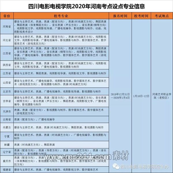四川電影電視學(xué)院河南省2020年??脊P試考試時間安排