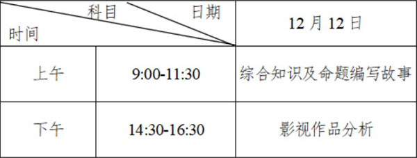 考試時(shí)間統(tǒng)一為2021年12月12日,考生須在考試前3天開(kāi)始登錄“報(bào)名繳費(fèi)指定系統(tǒng)”打印《專業(yè)考試證》,11日下午17時(shí)-18時(shí)期間前往考試地點(diǎn)熟悉筆試考場(chǎng),但不能進(jìn)入考室。“綜合知識(shí)及命題編寫故事”科目開(kāi)考15分鐘(12日上午9∶15)后,考生不得進(jìn)入考室;“影視作品分析”科目開(kāi)考前15分鐘(12日下午14∶15)后,考生不得進(jìn)入考室??忌仨殤{第二代居民身份證以及《專業(yè)考試證》在規(guī)定的時(shí)間和地點(diǎn)參加專業(yè)考試。其中筆試時(shí)間統(tǒng)一安排如下: