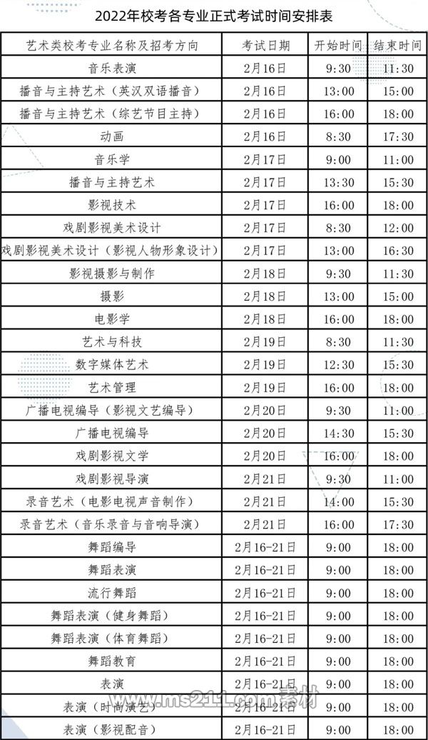 正式考試自2月16日開始,2月21日結(jié)束。正式考試時,各專業(yè)考試時間有嚴格的限制。詳細安排如下: