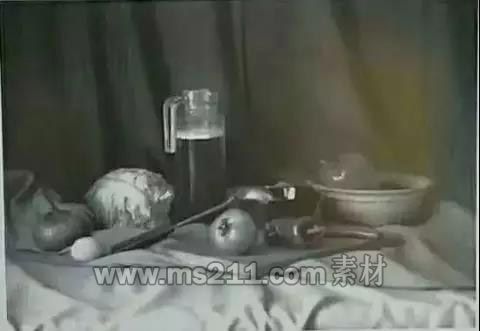 素描考題:一個(gè)石膏腳模型,一個(gè)玻璃茶壺,一個(gè)白瓷茶杯,一個(gè)紙筒,兩顆山楂,一塊淺色襯布,一塊灰色襯布,一塊深色襯布。