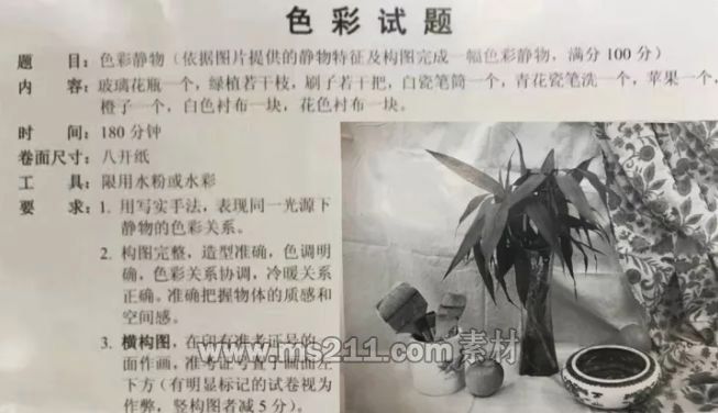 色彩考題:玻璃花瓶一個(gè),綠植若干枝,刷子若干把,白瓷筆筒一個(gè),青花瓷筆洗一個(gè),蘋果一個(gè),桔子一個(gè),白色襯布一塊,花色襯布一塊。