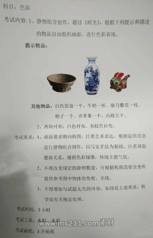 吉林藝術學院2019年繪畫(油畫、版畫、國畫、現(xiàn)代繪畫)、雕塑、美術學(師范)考試科目為色彩(靜物,3小時)、素描(人物頭像,3小時)。 吉林省考題:
