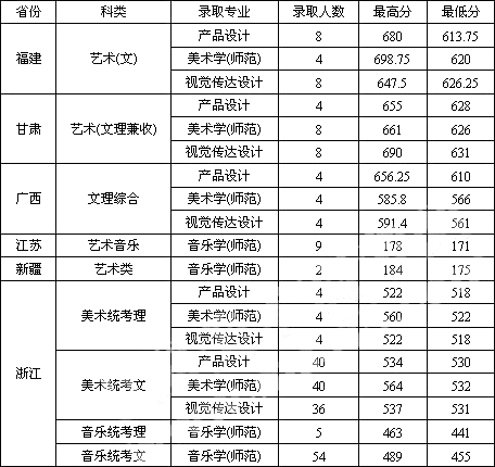 江蘇、新疆音樂(lè)招生使用該省的聯(lián)考成績(jī);甘肅、廣西和福建美術(shù)招生由我校單獨(dú)組織專業(yè)考試,在思想政治品德考核和體檢合格、專業(yè)和文化成績(jī)達(dá)到分?jǐn)?shù)線的情況下,均按綜合分(綜合分=專業(yè)成績(jī)×80%+文化成績(jī)×20%)從高到低錄取。浙江省的藝術(shù)類按照綜合分從高到底錄取