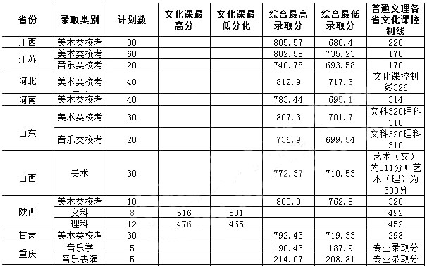 省外考生須參加我校單獨(dú)組織的藝術(shù)類(lèi)專(zhuān)業(yè)??疾⑷〉煤细褡C,在文化課和專(zhuān)業(yè)課達(dá)到規(guī)定要求后,按綜合分從高分到低分擇優(yōu)錄取。綜合分=(專(zhuān)業(yè)成績(jī)÷專(zhuān)業(yè)總分)×700+(文化成績(jī)÷文化滿(mǎn)分)×300;安徽省使用省統(tǒng)考成績(jī)錄取,按照該安徽省規(guī)定的綜合分進(jìn)行投檔與錄取。美術(shù)類(lèi)專(zhuān)業(yè)含動(dòng)畫(huà)、美術(shù)學(xué)、攝影、視覺(jué)傳達(dá)設(shè)計(jì)、環(huán)境設(shè)計(jì)、產(chǎn)品設(shè)計(jì)、藝術(shù)與科技,音樂(lè)類(lèi)專(zhuān)業(yè)含音樂(lè)學(xué)、音樂(lè)表演。
