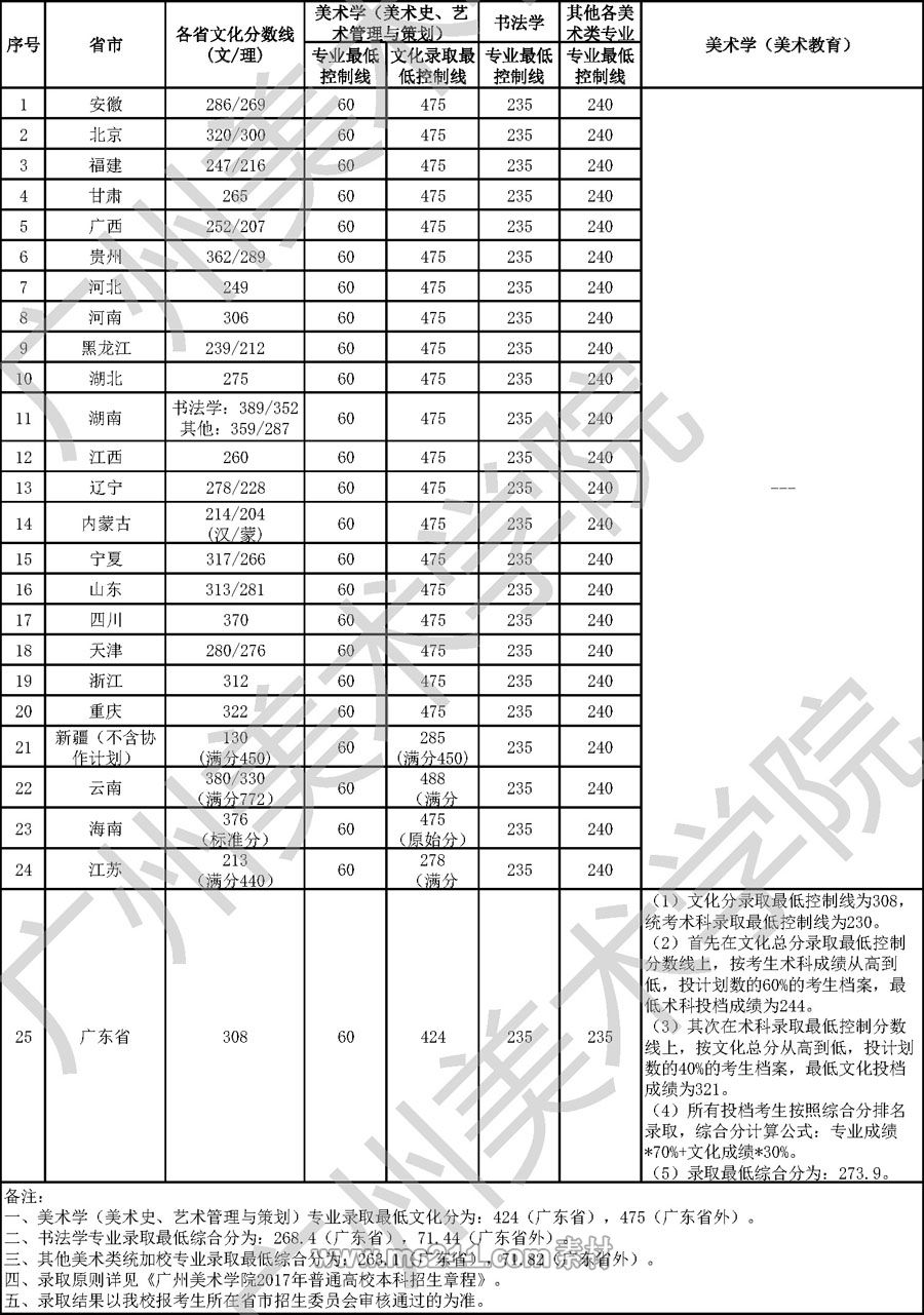 廣州美術(shù)學(xué)院2017年廣東省普通本科錄取最低控制分?jǐn)?shù)線