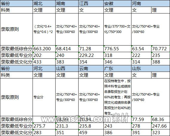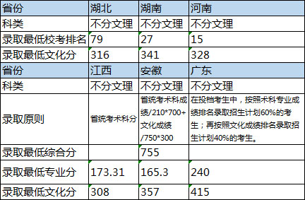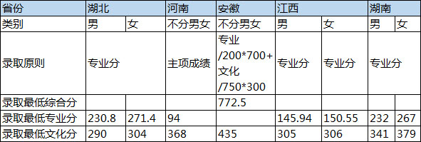 1.對于有統(tǒng)一投檔原則的省份,按照相關(guān)省份投檔原則投檔,在文化和專業(yè)都合格的投檔考生中,按照投檔成績由高到低錄取,高考文化成績無單科要求,湖北考生要求省統(tǒng)考專業(yè)成績達到240分;