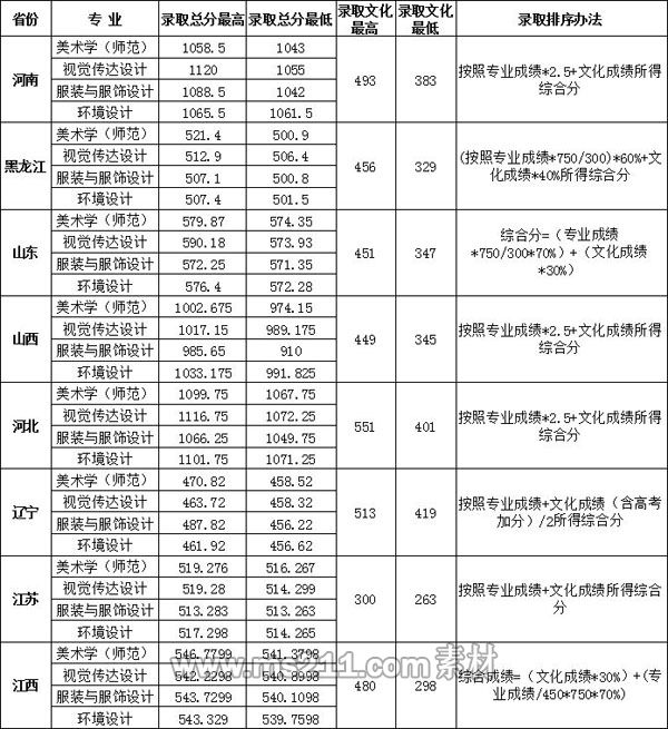 美術(shù)學(xué)、視覺傳達(dá)設(shè)計(jì)、服裝與服飾設(shè)計(jì)、環(huán)境設(shè)計(jì):以綜合分投檔的省份,按照綜合分排序由高分到低分擇優(yōu)錄取;其他省份,按照專業(yè)成績乘以2.5加上文化成績所得的綜合分排序由高分到低分擇優(yōu)錄取。