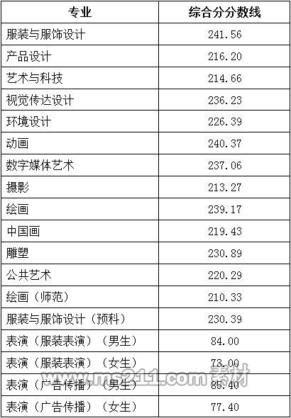 2.服裝與服飾設計專業(yè)、產(chǎn)品設計專業(yè)、藝術與科技專業(yè)、視覺傳達設計專業(yè)、環(huán)境設計專業(yè)、動畫專業(yè)、數(shù)字媒體藝術專業(yè)、攝影專業(yè)、繪畫專業(yè)、中國畫專業(yè)、雕塑專業(yè)、公共藝術專業(yè)為生源省份藝術本科錄取控制分數(shù)線,并且要求外語科目成績不得低于60分(150分制)。