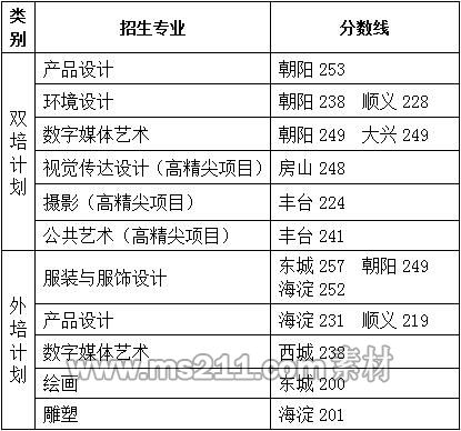 考生在達到北京市藝術類本科錄取控制分數(shù)線,且“雙培計劃”外語成績不得低于60分,“外培計劃”英語成績不得低于90分的基礎上,按照北京市美術統(tǒng)考考試成績從高分到低分擇優(yōu)錄取。經(jīng)研究確定錄取分數(shù)線為(見下表)