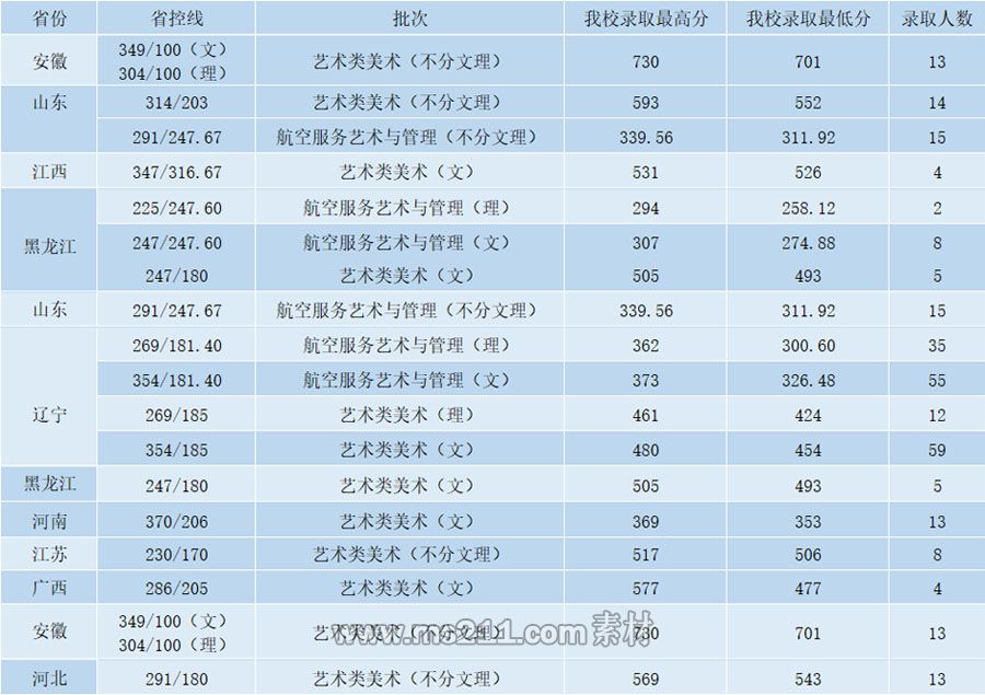 (2)航空服務(wù)藝術(shù)與管理本科專業(yè):該專業(yè)面向遼寧省、吉林省、黑龍江省、山東省招生。考生需參加我校專業(yè)??疾⑷〉煤细瘢幕荚嚦煽冃柽_(dá)到考生所在省確定的藝術(shù)類本科控制線以上,按綜合分從高到低錄取,綜合分=高考文化成績×40%+專業(yè)??汲煽?times;60%。當(dāng)考生綜合分相同時,藝術(shù)(文)以及不分文理省份的考生錄取時,依次按考生的語文、數(shù)學(xué)、外語、專業(yè)??汲煽儚母叩降弯浫?,藝術(shù)(理)考生錄取時,依次按考生的數(shù)學(xué)、語文、外語、專業(yè)校考成績從高到低錄取。