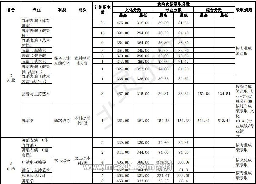 藝術(shù)類專業(yè)舞蹈表演、表演專業(yè)考生須參加武漢體育學(xué)院組織的遠(yuǎn)程網(wǎng)上專業(yè)測試且??汲煽冞_(dá)到學(xué)校合格控制分?jǐn)?shù)線。舞蹈表演、表演專業(yè)考生文化成績達(dá)到所在省份錄取控制分?jǐn)?shù)線后,按校考專業(yè)成績排序錄取。 報考學(xué)校播音與主持藝術(shù)專業(yè)的山東、河北、廣東、內(nèi)蒙古的考生須參加學(xué)校組織的遠(yuǎn)程網(wǎng)上專業(yè)測試,在??汲煽冞_(dá)到學(xué)校合格控制分?jǐn)?shù)線,文化成績達(dá)到所在省份錄取控制分?jǐn)?shù)線后,按文化成績、專業(yè)成績綜合排序(綜合分=專業(yè)成績+文化成績/文化總分×100),從高到低錄取,其他省份認(rèn)可省統(tǒng)考(聯(lián)考)成績。