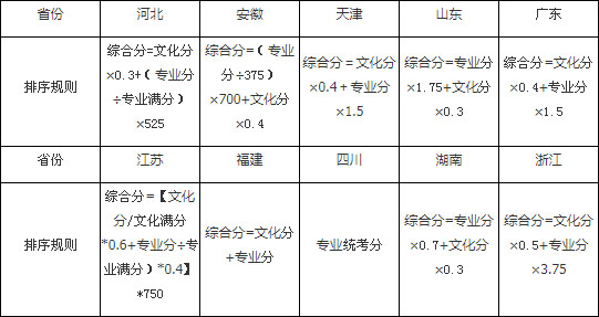 4.美術(shù)類專業(yè)按各省教育考試院美術(shù)類專業(yè)統(tǒng)考考生的投檔分(綜合分或?qū)I(yè)統(tǒng)考分或文化分)從高到低擇優(yōu)錄取。各省專業(yè)錄取的排序規(guī)則如下: