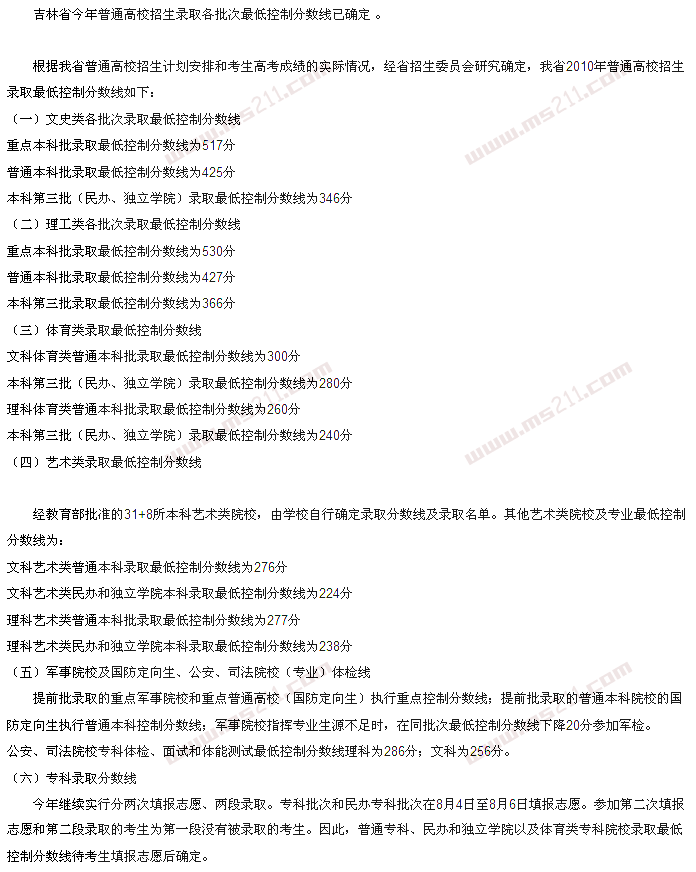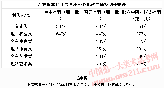 根據(jù)吉林省普通高校招生計(jì)劃安排和考生高考成績的實(shí)際情況,經(jīng)省招生委員會研究確定,吉林省2012年普通高校招生錄取第一段各批次最低控制分?jǐn)?shù)線確定如下: