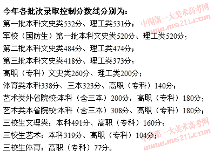 第一批本科文史類521分、理工類515分;第二批本科文史類479分、理工類462分;第三批本科文史類411分、理工類366分;高職(??疲┪氖奉?63分、理工類200分。