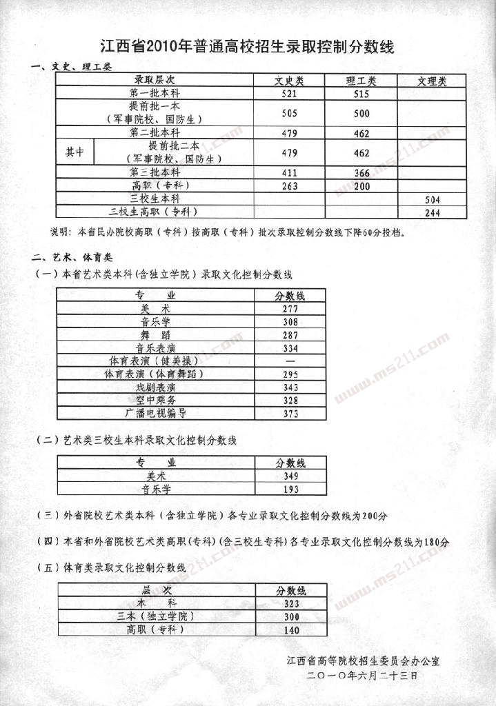 2010年江西高考錄取分數(shù)線(含美術(shù))