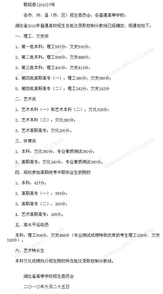 2010年湖北高考錄取分?jǐn)?shù)線(含美術(shù))