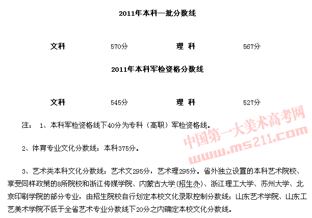3、藝術(shù)類本科文化分?jǐn)?shù)線:藝術(shù)文300分,藝術(shù)理290分;省外獨(dú)立設(shè)置的本科藝術(shù)院校、享受同樣政策的8所院校,和浙江傳媒學(xué)院、內(nèi)蒙古大學(xué)的部分專業(yè),由招生院校自行劃定本科文化錄取控制分?jǐn)?shù)線;山東藝術(shù)學(xué)院、山東工藝美術(shù)學(xué)院不低于全省藝術(shù)專業(yè)分?jǐn)?shù)線下20分之內(nèi)確定本校文化分?jǐn)?shù)線。