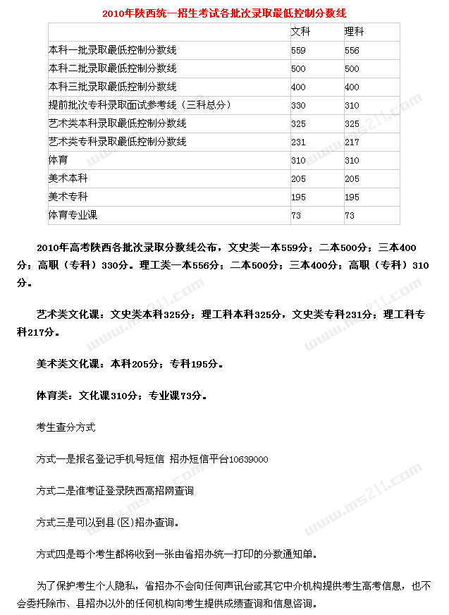 2010年陜西高考錄取分?jǐn)?shù)線(含美術(shù))