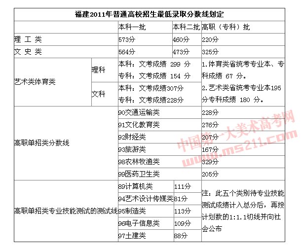 2011年福建省普通高等學(xué)校招生錄取控制分?jǐn)?shù)線
