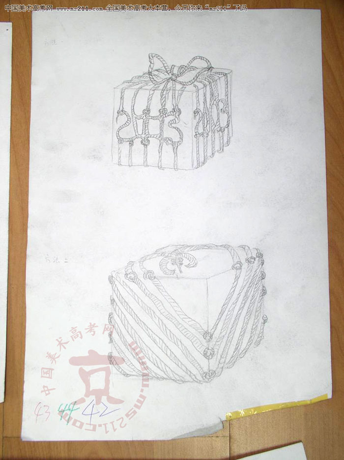 2003年北京服裝學(xué)院美術(shù)高考優(yōu)秀試卷(第1套創(chuàng)意速寫:繩子捆綁正方體)2007102915
