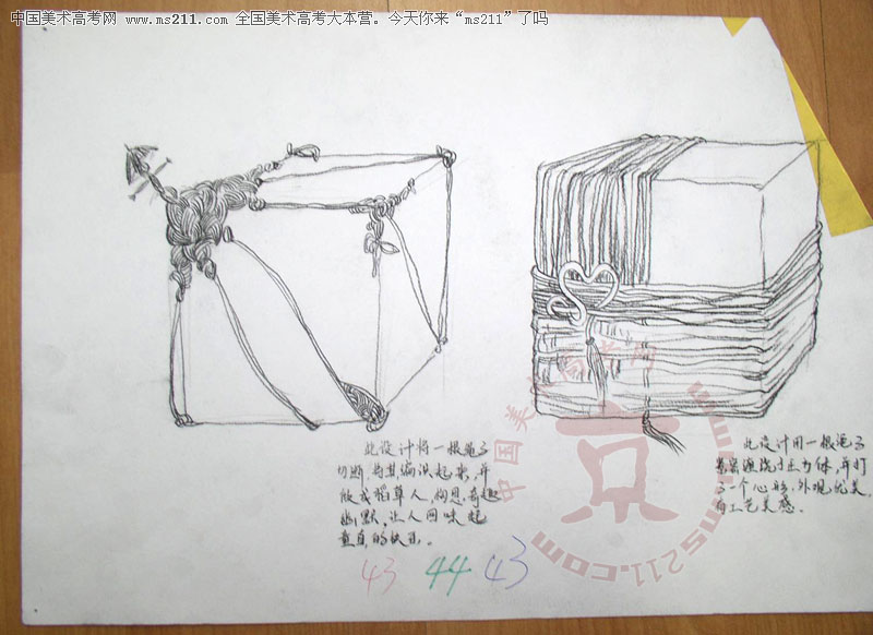 2003年北京服裝學(xué)院美術(shù)高考優(yōu)秀試卷(第1套創(chuàng)意速寫(xiě):繩子捆綁正方體)2007102916