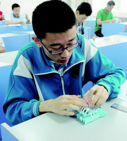 “拿到題之后,立馬在腦中想象一個(gè)結(jié)構(gòu),上下左右都有架子拼接來(lái)保護(hù)雞蛋。”來(lái)自山大附中的任騰龍第一個(gè)走出考場(chǎng),不過(guò)對(duì)最終的成果,他并不滿意,“想得很好,但真動(dòng)起手來(lái)還是有點(diǎn)力不從心。”
