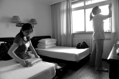 昨天下午,王麗榮帶隊(duì),古城中學(xué)西語(yǔ)班的學(xué)生們集體包車從石景山到達(dá)西城區(qū)156中考點(diǎn)附近的賓館。由于跨區(qū)考試,家長(zhǎng)們集體在學(xué)校周圍租了賓館。在賓館里,母女倆簡(jiǎn)單收拾了行李,王麗榮就留女兒在房間復(fù)習(xí),自己“躲”出去了。