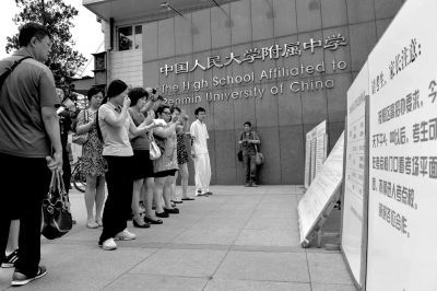 人大[微博]附中,考生及家長(zhǎng)[微博]前來確認(rèn)考場(chǎng)。