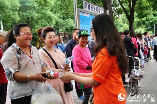 志愿者為考生家長(zhǎng)分發(fā)礦泉水