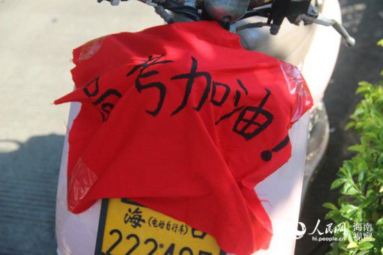 6月8日,海口送考家長電動車上的高考加油橫幅