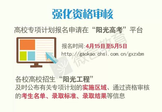 高校專(zhuān)項(xiàng)計(jì)劃報(bào)名申請(qǐng)?jiān)?strong>“陽(yáng)光高考”平臺(tái)(http://gaokao.chsi.com.cn/gxzxbm)進(jìn)行,報(bào)名時(shí)間為4月15日至5月5日。4月15日前,有關(guān)省級(jí)教育行政部門(mén)向社會(huì)公布本?。▍^(qū)、市)確定的實(shí)施區(qū)域,有關(guān)高校公布招生簡(jiǎn)章。