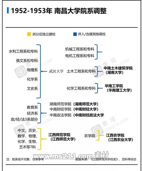 1953年,南昌大學文史系、俄文系、物理系、化學系以及水利工程系及專修科并入武漢大學(分數線,專業(yè)設置);機械工程系和???、電機工程系和??撇⑷肴A中工學院(現華中科技大學);南昌大學土木工程系和專科并入中南土木建筑學院(現湖南大學)......