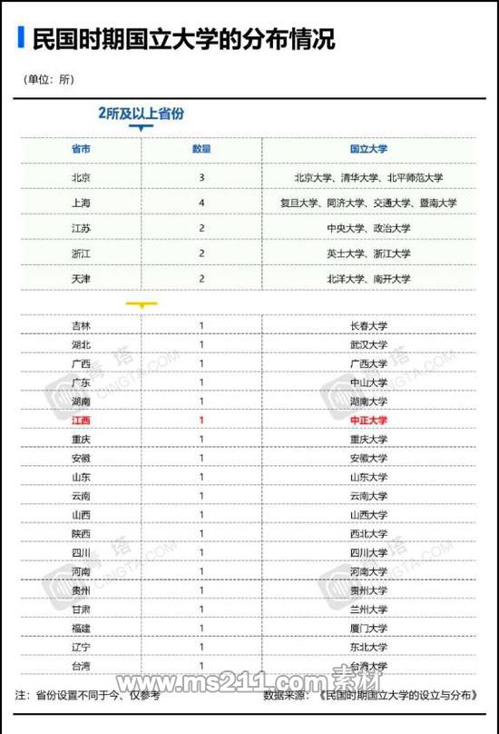 當時,除北京、上海、天津、江蘇和浙江五地有超過一所以上國立大學外,江西等其余各省都大致有一所國立大學。