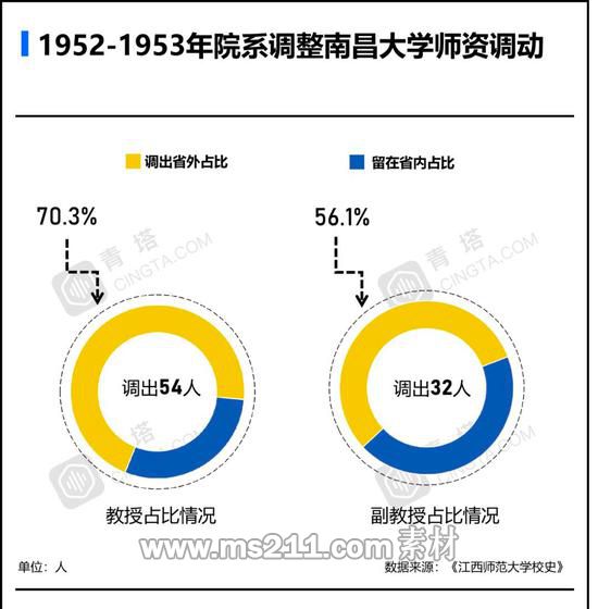 據《江西師范大學校史》記載,“此次院系調整,南昌大學調出到省外的教授有54人,副教授有32人,分別占南昌大學教授、副教授總數的70.3%和56.1%。”