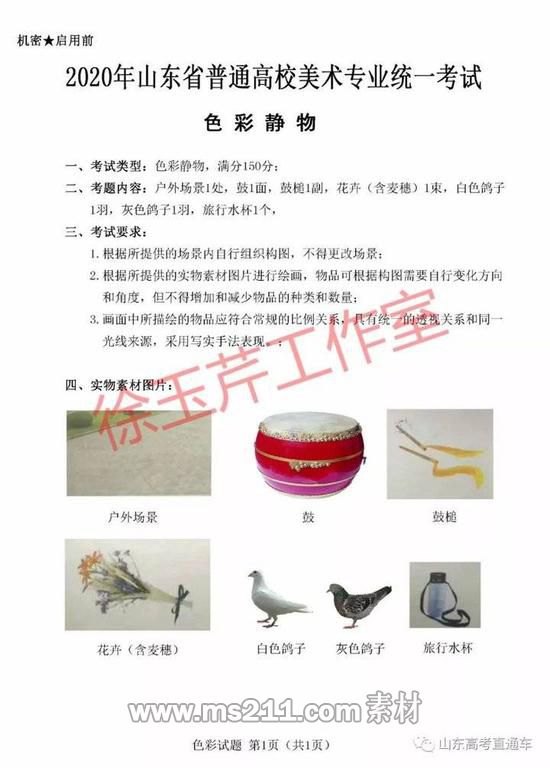 此次色彩基礎(chǔ)所給的考題內(nèi)容是:戶外場景、鼓、鼓槌,花卉(含麥穗)、白色鴿子、旅行水杯,要求考生在所提供的場景內(nèi)自行組織構(gòu)圖,不得變換場景。