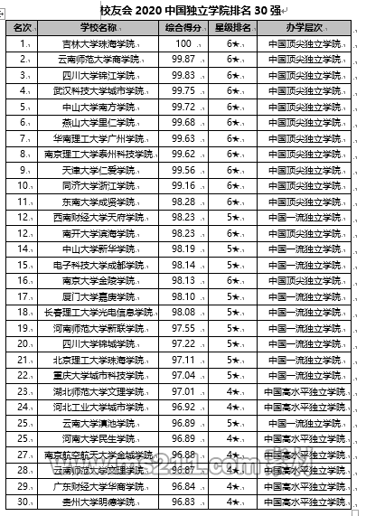 吉林大學珠海學院雄居2020中國獨立學院排名榜首,中山大學南方學院躋身全國5強
