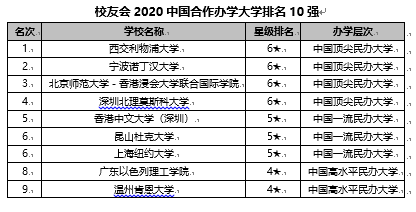 在校友會2020中國合作辦學大學排名中,西交利物浦大學排名全國第1,寧波諾丁漢大學第2,北京師范大學(分數(shù)線,專業(yè)設置)-香港浸會大學聯(lián)合國際學院第3,深圳北理莫斯科大學第4,香港中文大學(深圳)第5,昆山杜克大學和上海紐約大學并列第6,廣東以色列理工學院第8,溫州肯恩大學第9。