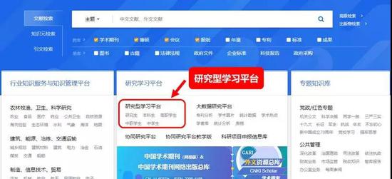 打開知網(wǎng)首頁(cnki.net),點(diǎn)擊紅框內(nèi)“研究型學(xué)習(xí)平臺(tái)”。